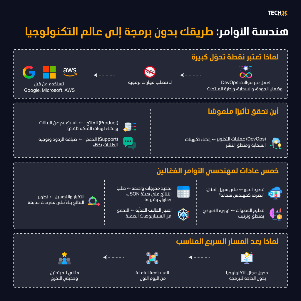 الدخول في مجالات مثل الحوسبة السحابية، DevOps، اختبار الجودة (QA)، أو هندسة البرمجيات كان يتطلب عادةً إتقان البرمجة. لكن هناك طريق أذكى: هندسة النصوص المُدخَلة — توجيه أنظمة الذكاء الاصطناعي باستخدام لغة طبيعية. لا حاجة لكتابة كود. والعديد من الشركات الرائدة بدأت بالفعل في اعتبارها مهارة أساسية.