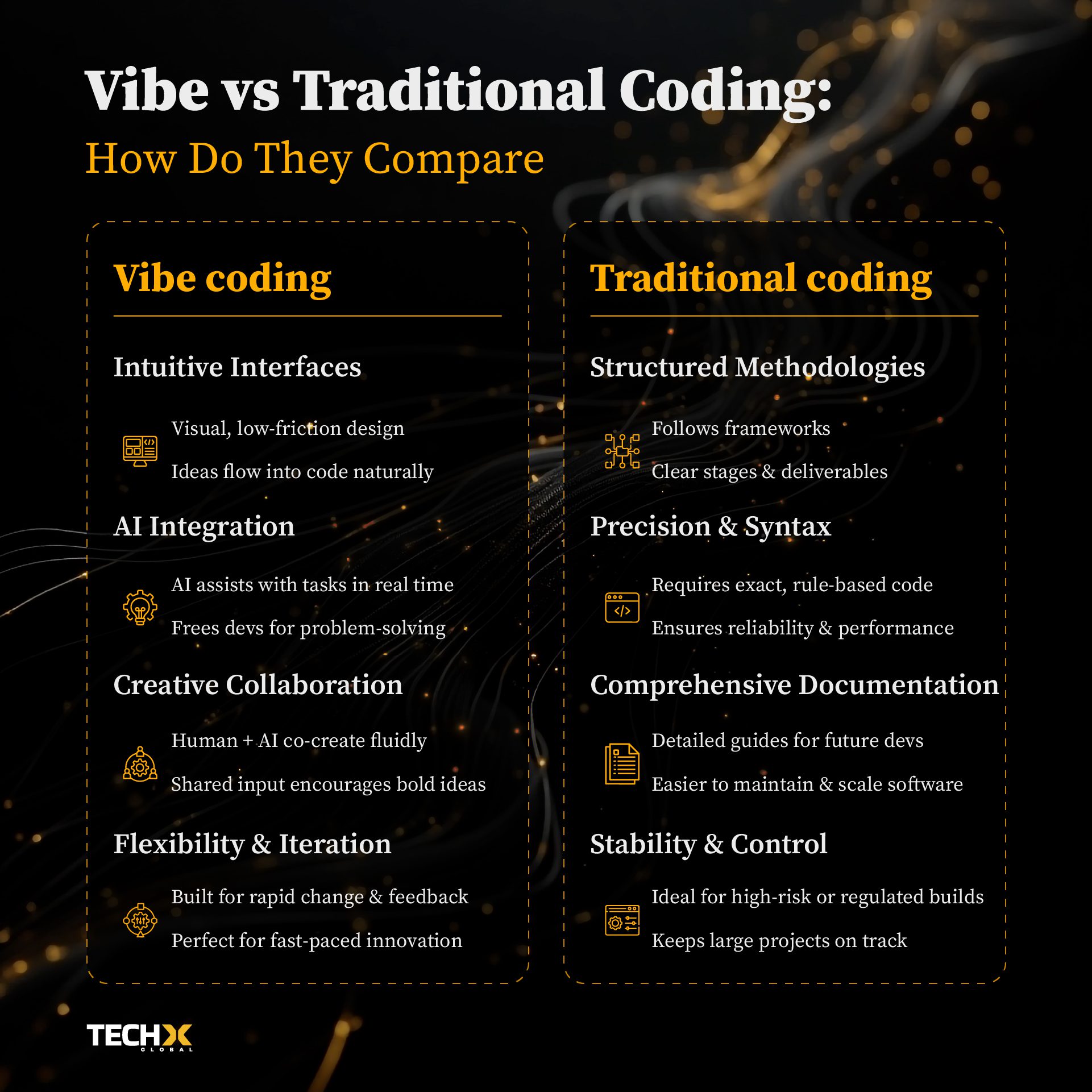 Traditional coding sticks to structure—suited for precision-heavy, stable projects. Rigid frameworks help keep large or regulated builds on track.